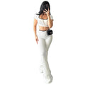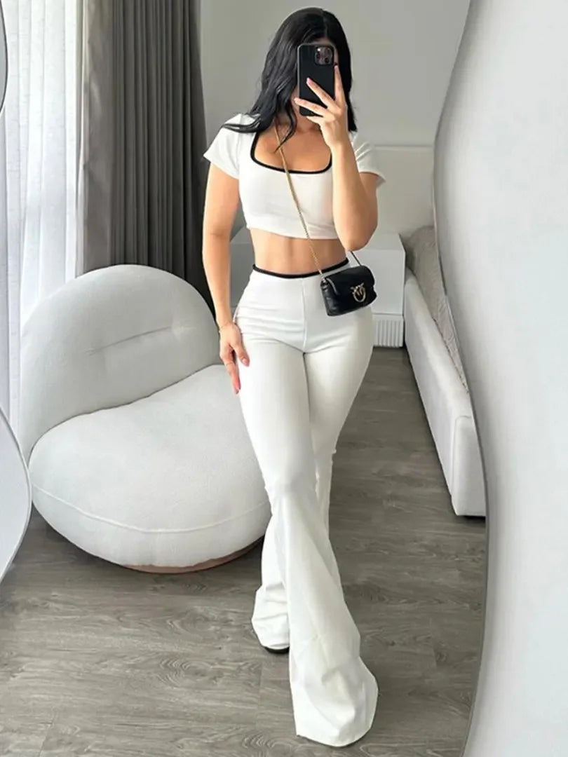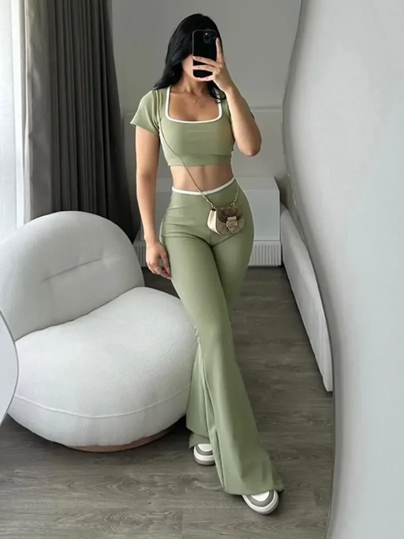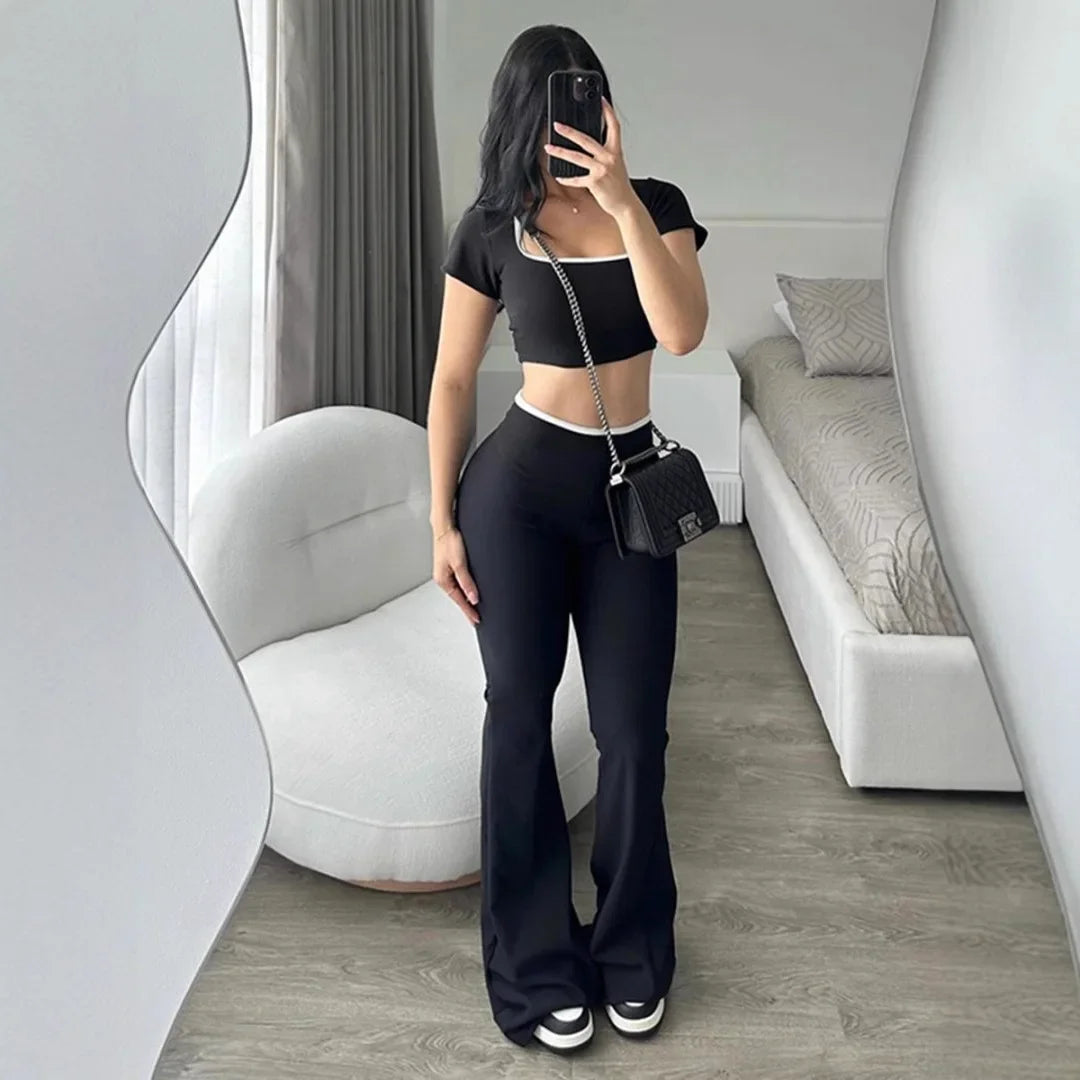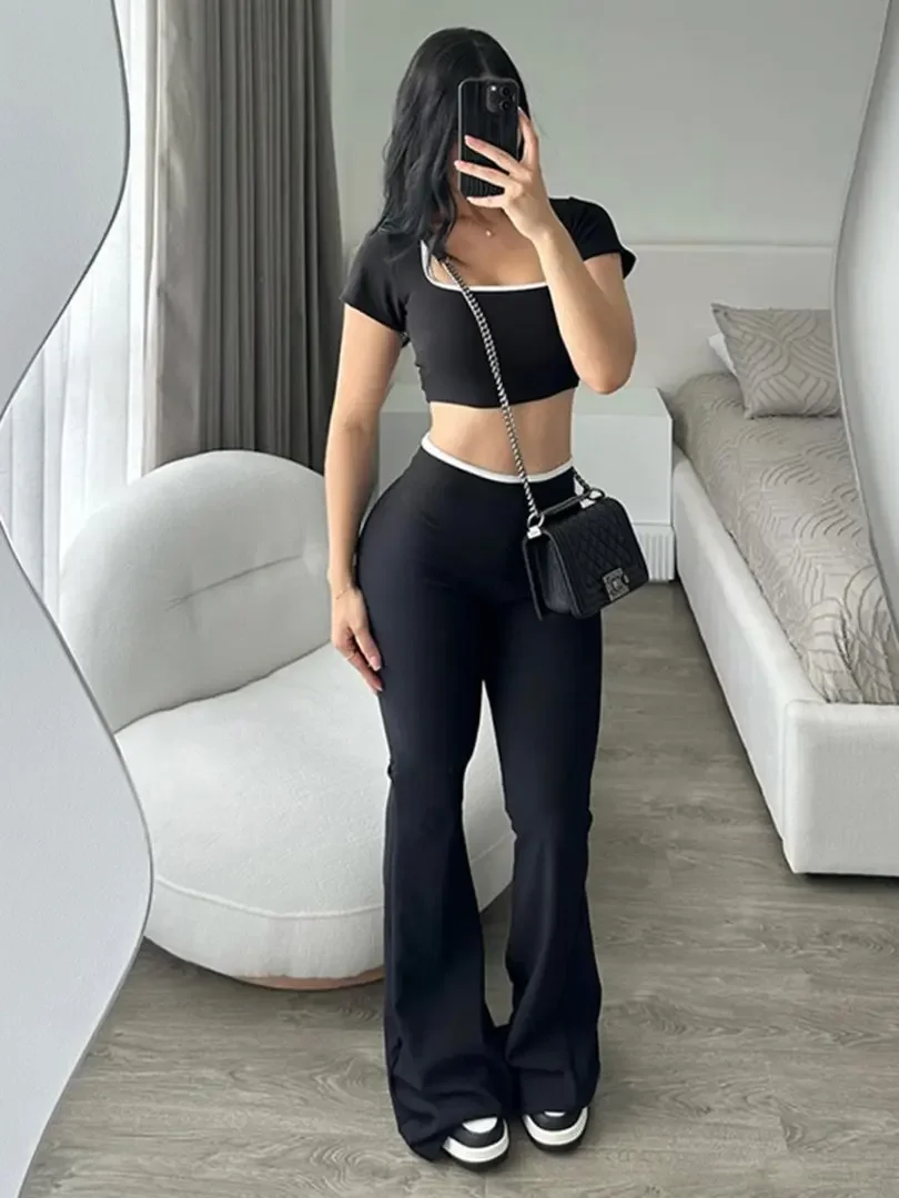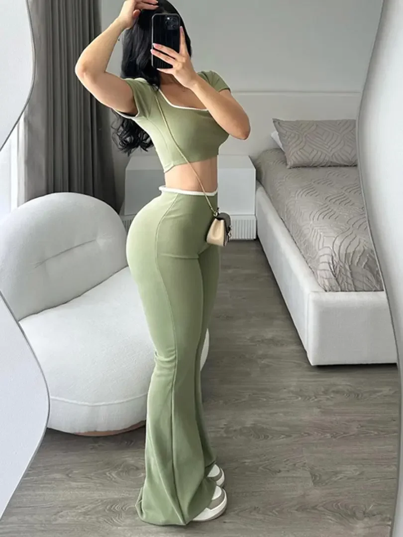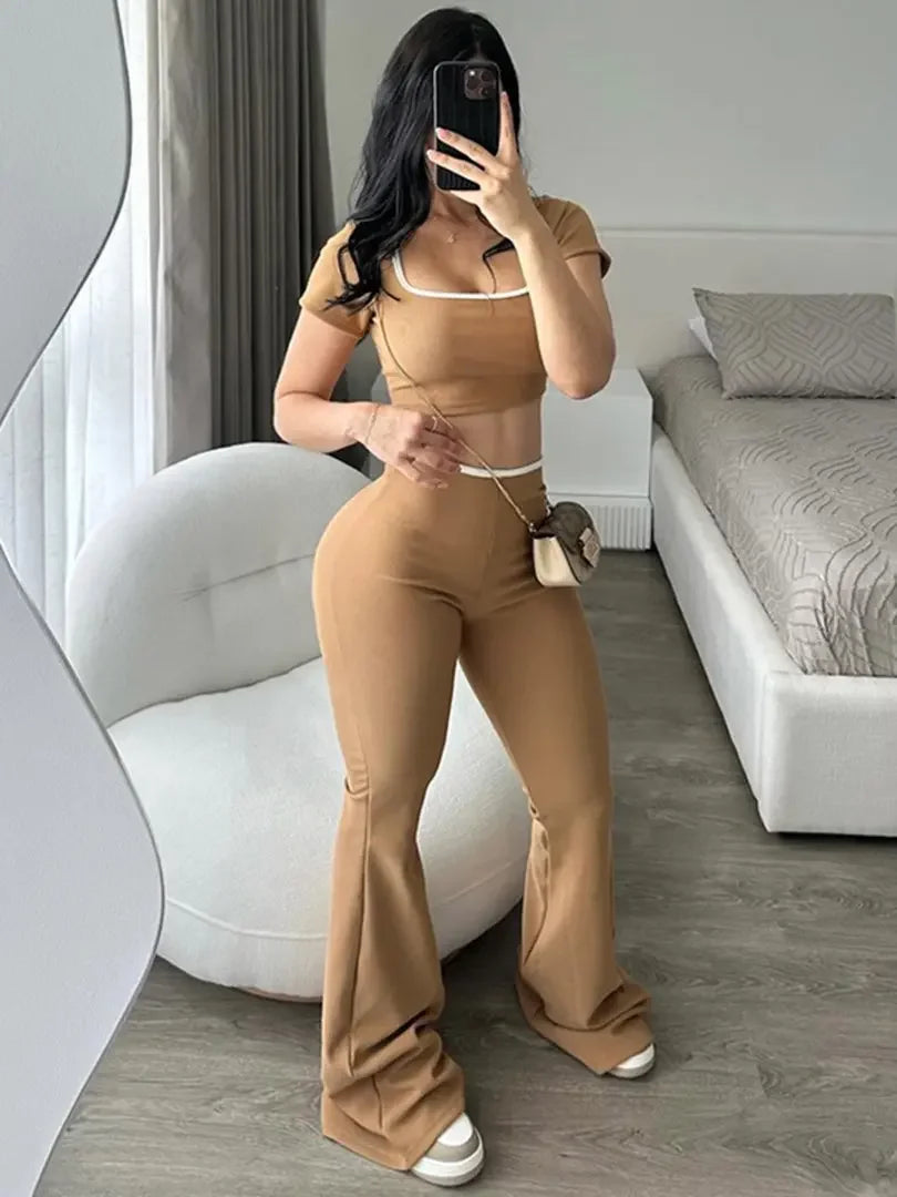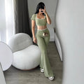 New Pure Color Casual Sports Style Slim Fit Short Sleeve Bell Bottom Pants Set Polyester Fiber Made in China Women's Wear